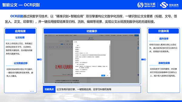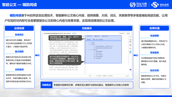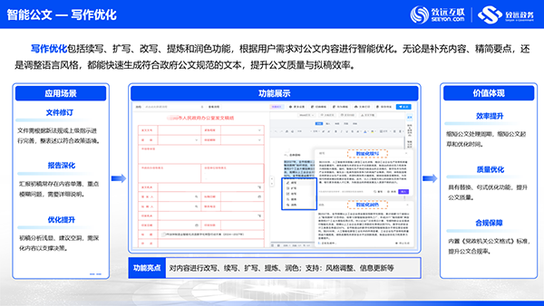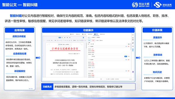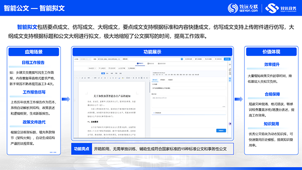 全流程智能化:通过AI技术改变传统拟文、办件方式,覆盖拟文、纠错、排版、阅读等核心场景,实现从“好用”到“智用”的升级。