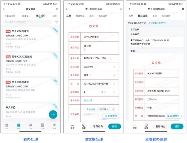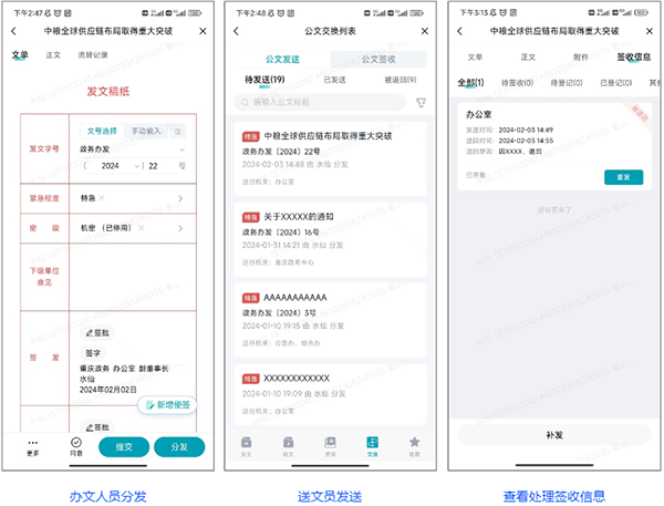 支持公文分发、签收、登记、转办等操作在移动端完成;