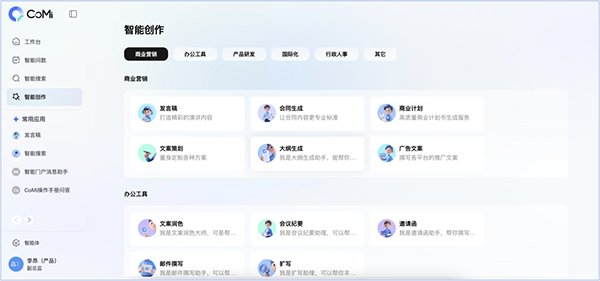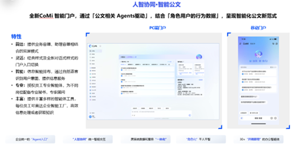 CoMi产品家族是致远互联AI中台与前端应用的集群产品,借助CoMi 智能门户、公文管理智能体、公文审核智能体等AI能力与传统公文管理结合,实现了公文管理AI化的全面提升。