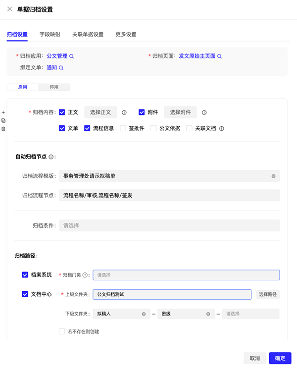 灵活归档模式:可根据流程节点自动归档,或由归档员手动操作,满足不同组织管理需求