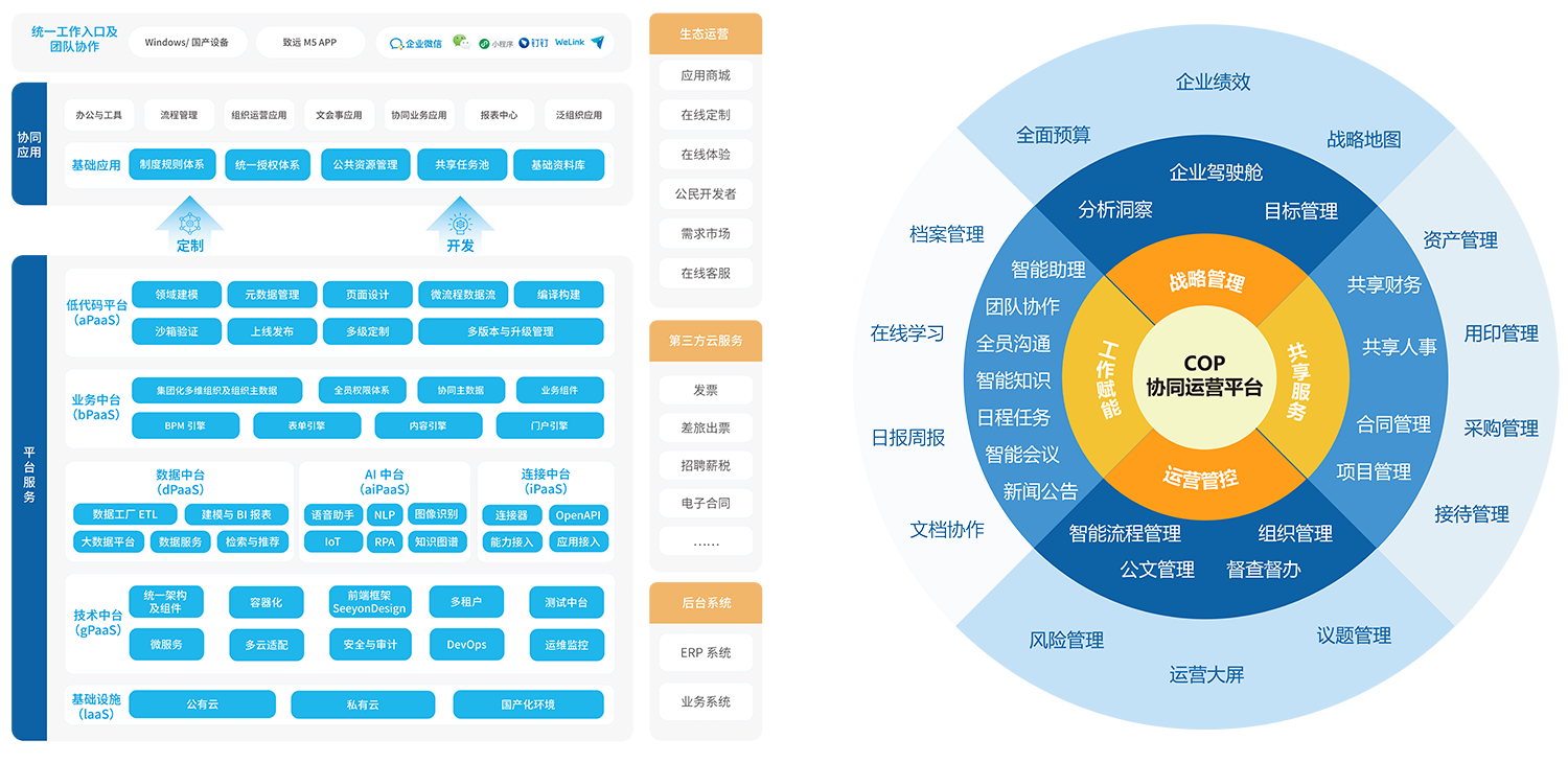 以云原生技术架构为核心,具备高性能、高并发、高可用、多租户、多云适配等核心特性。支持集团化多维组织及组织主数据管理,覆盖战略管理、运营管控、工作赋能、共享服务等全场景应用。提供低代码开发平台、元数据管理、多级定制等功能,满足大型集团多业态、跨区域、复杂业务的个性化需求,适配私有云、公有云等多种部署模式。